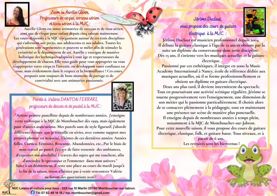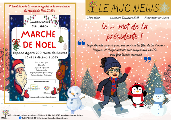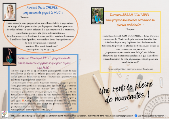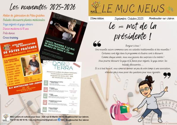 Le MJC News vous donne des informations sur la vie de la MJC avec des présentations des intervenants, des activités, des membres du bureau, ..., les différents évènements passés ou à venir et pas que ...